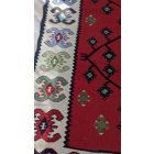 Ez az egyedi, kézzel szőtt kilim szőnyeg valószínűleg Kelet-Európából vagy a Balkán térségéből származik, ahol nagy hagyománya van a gyapjúszövésnek. A szőnyeg 100%-ban természetes gyapjúból készült, jellegzetes vörös középrésszel és krémszínű szegéllyel, amelyet stilizált növényi és szimbolikus motívumok díszítenek.